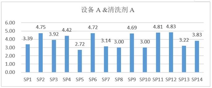由以上實(shí)驗(yàn)結(jié)果條形圖可以直觀地看出,18塊板子在設(shè)備A、B、C、D中被清洗的結(jié)果完全不同。設(shè)備A工作后達(dá)到的最大潔凈度是4,設(shè)備B中所有板子普遍穩(wěn)定在4-5之間,設(shè)備C中有最多達(dá)到水平為5的板子,設(shè)備D中結(jié)果起伏最大。由此判斷,當(dāng)使用相同堿性清洗劑時(shí),同一款污染物在四種不同的設(shè)備中呈現(xiàn)不同的清洗效果。